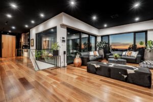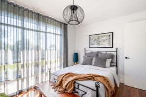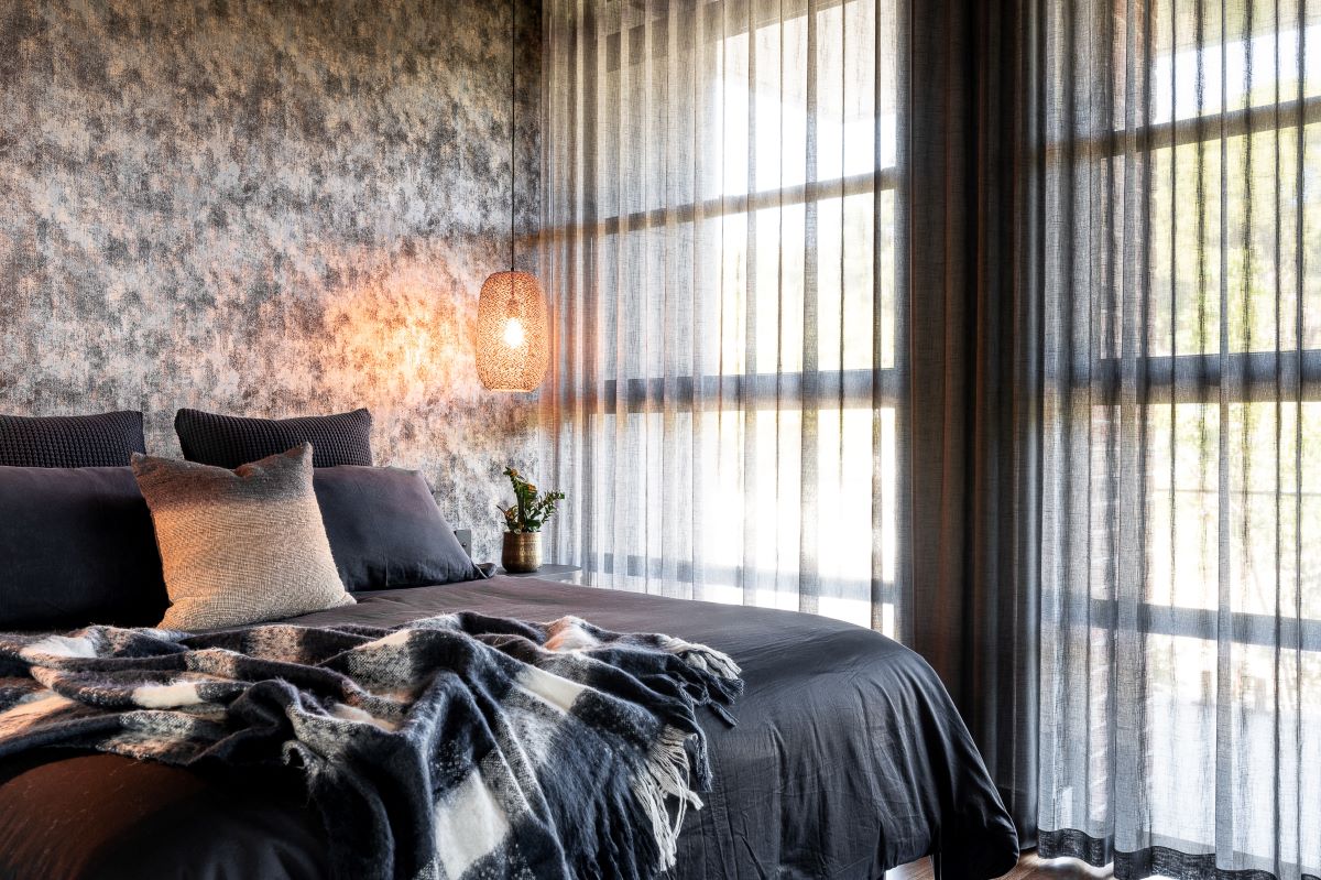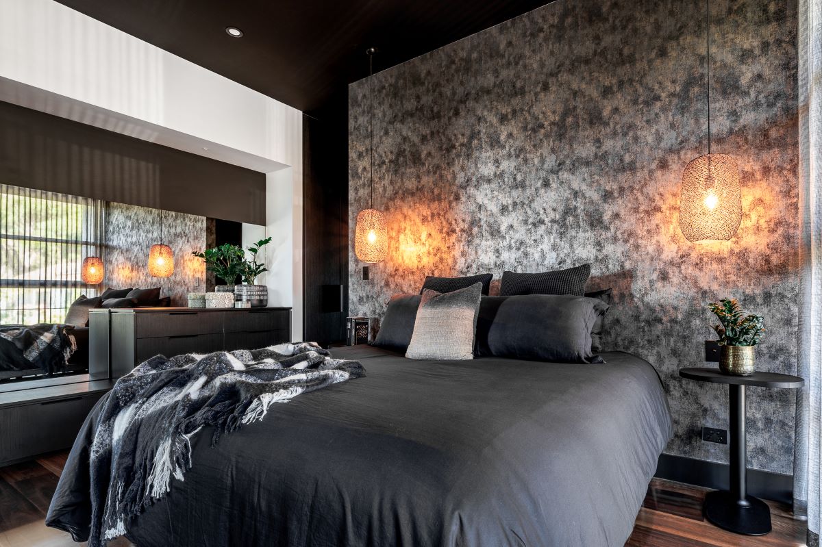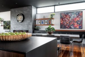 The home features a reverse living design, placing the main living areas and master suite on the ground floor to capitalise on panoramic vistas, while the additional bedrooms and secondary bathroom occupy the lower ground floor. The open-plan living space, balcony, and real flame fireplace were all carefully positioned to make the most of the breathtaking outlook. Every detail was meticulously considered to create a functional yet visually striking home that harmonises with the site’s contours.