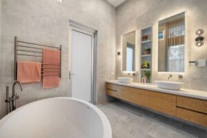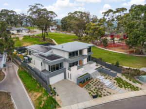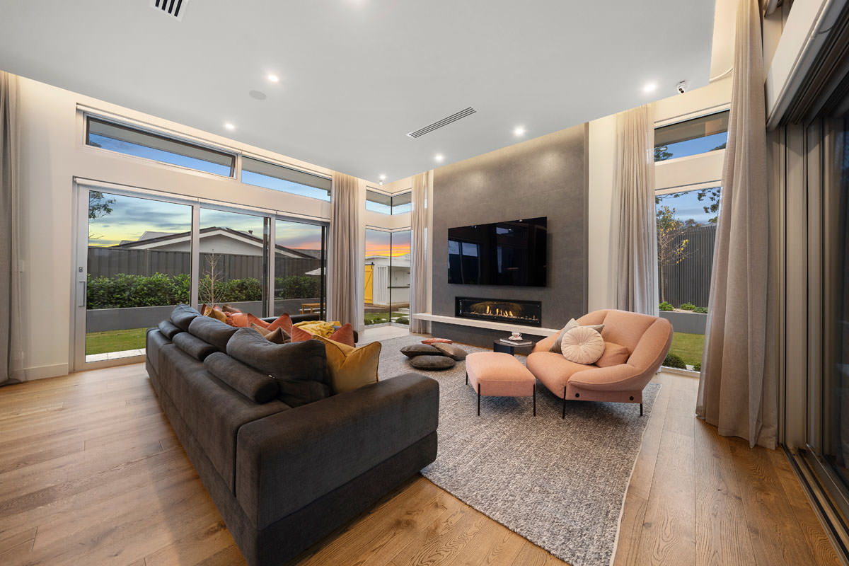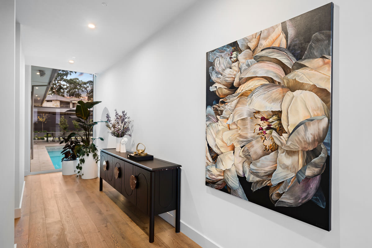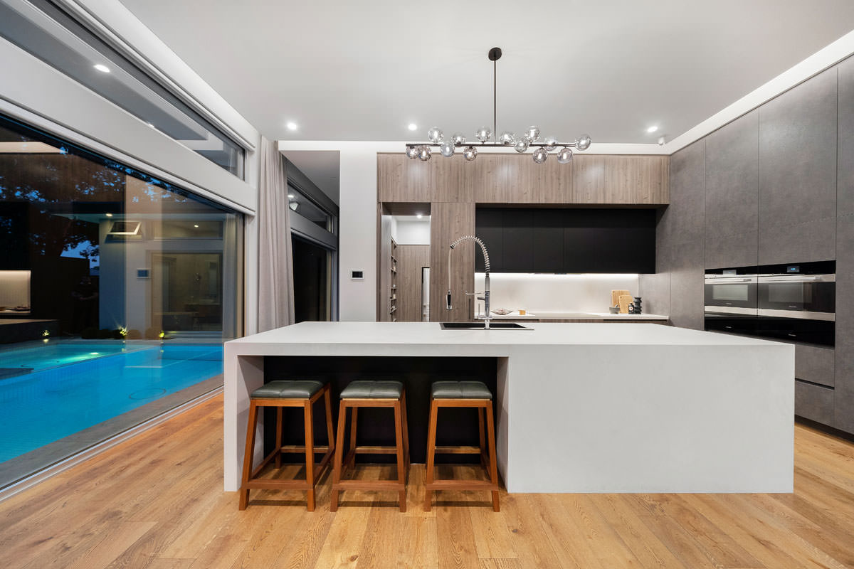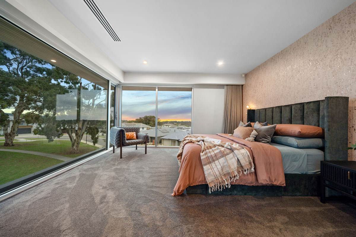 Additional rooms are cleverly positioned on upper and lower levels to reduce the home’s footprint and accommodate the slope. The lower level includes a wine room, home theatre, moody powder room, garage, and workshop, while the upper level houses a guest suite with dual-aspect views and a quiet study. Finishes throughout harmoniously blend warm timber, natural stone, concrete, and metal-look joinery, complemented by abundant storage. This home has been designed to evolve with the family, offering elegance, practicality, and long-term enjoyment for years to come.