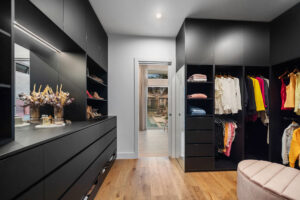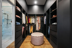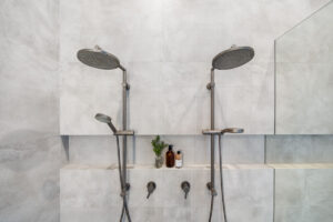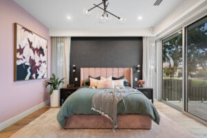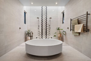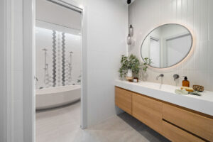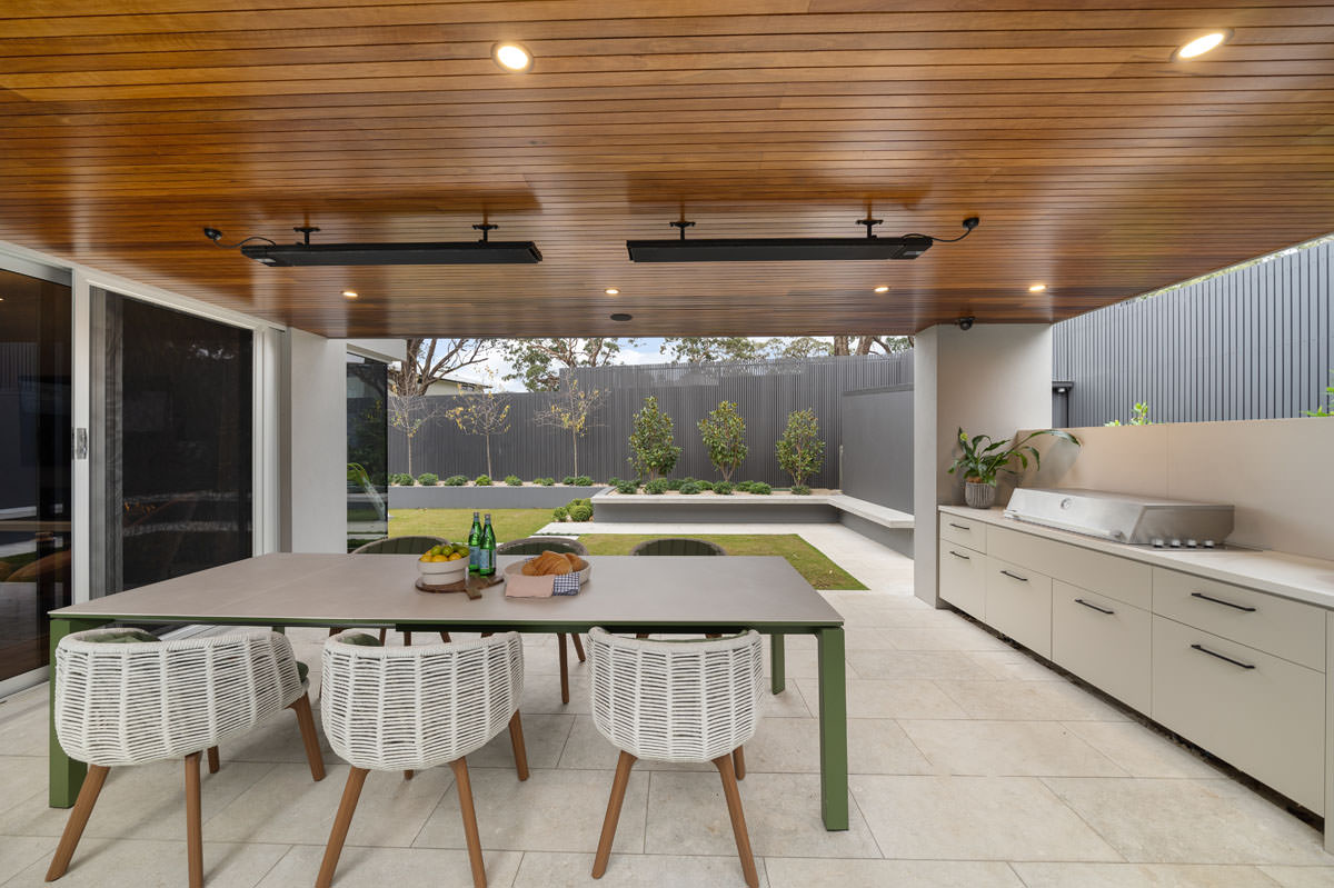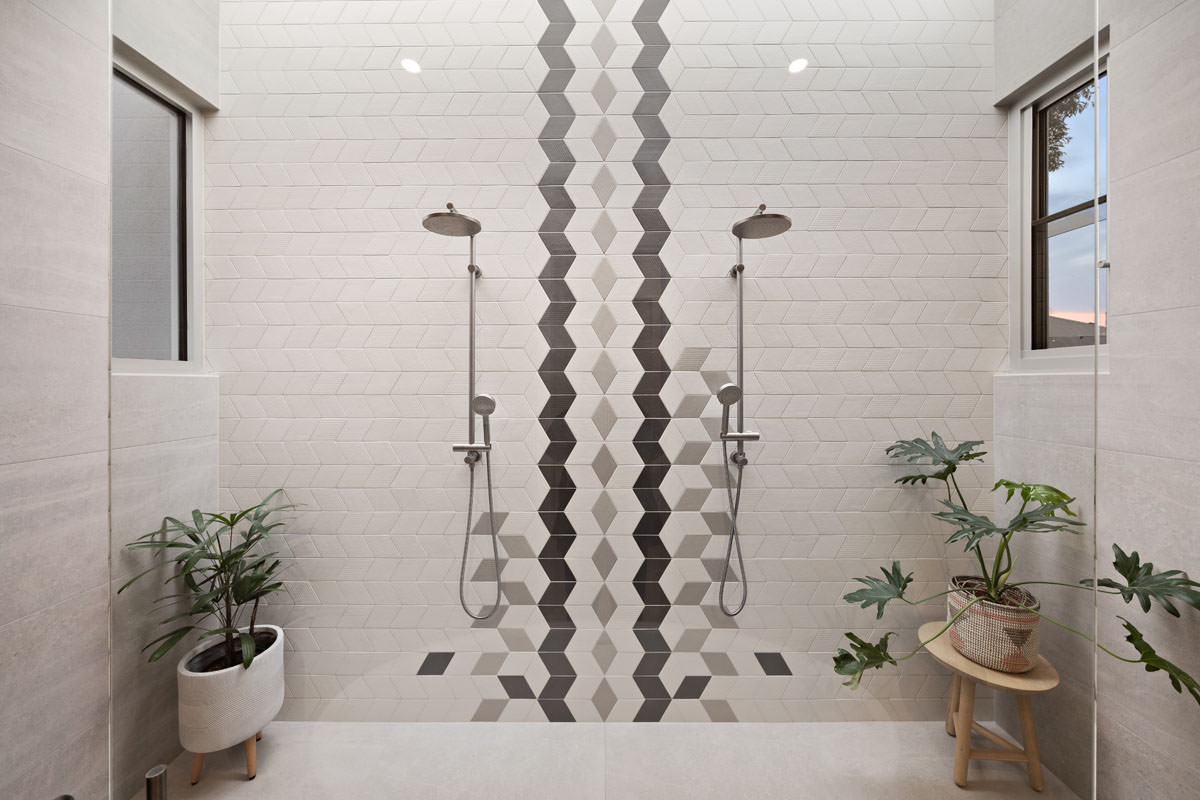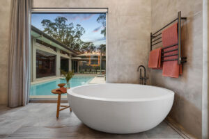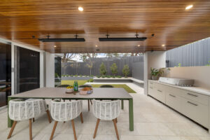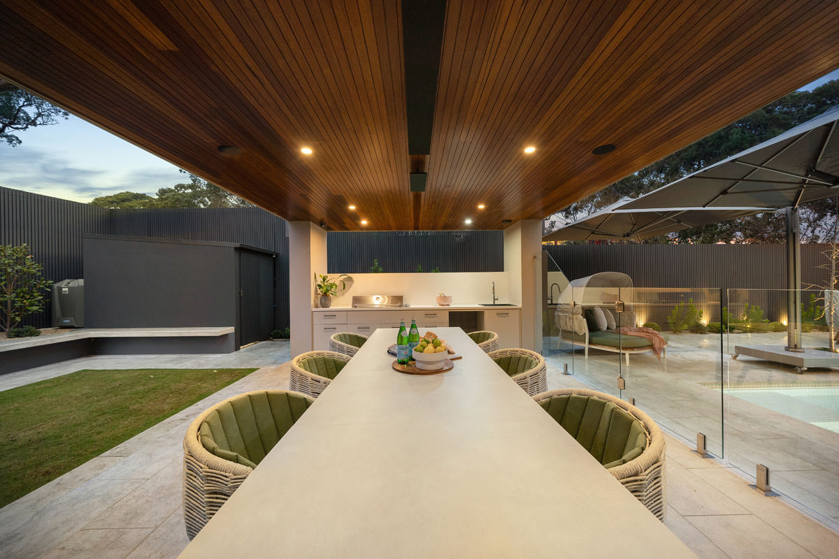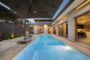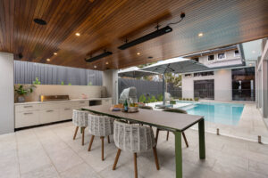 The floorplan allows the kitchen, dining, and family living areas to take full advantage of natural light and garden views through oversized dual-aspect windows. A dedicated children’s wing, complete with a luxurious bathroom featuring a skylight above a double shower, balances functionality and privacy. Outdoor living is seamlessly incorporated with alfresco dining, a large pool and spa, a kids’ play area, and a vegetable garden, maximising the use of every square metre while maintaining a generous backyard.