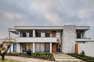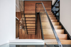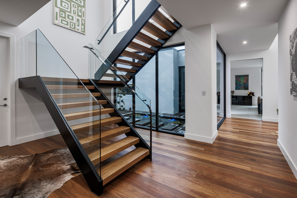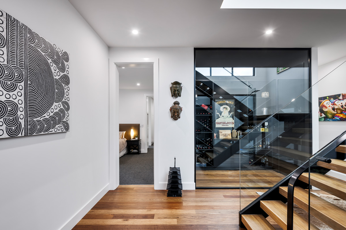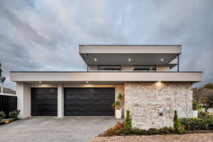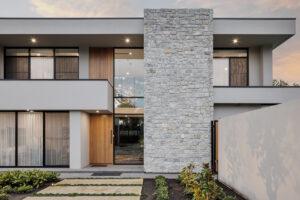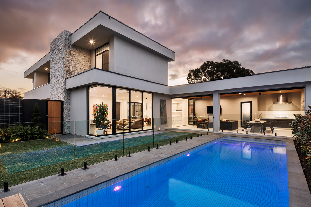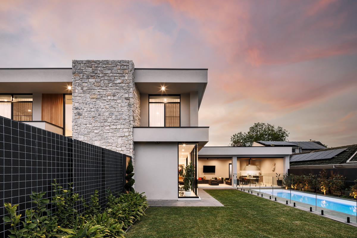 This Hazelwood Park home, winner of the 2023 Residential Design Award at the SA HIA Housing Awards, is a masterclass in modern contemporary design. Precision Homes has crafted a two-storey residence with a Rationalist-inspired aesthetic, using clean lines, feature stone columns, and dual balconies to create striking angles from every external perspective. The central glass entry spans two storeys, flooding the interior with natural light and offering views of a central cloud tree and pond, while a feature staircase guides movement through the home around the pool and living zones.