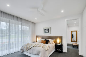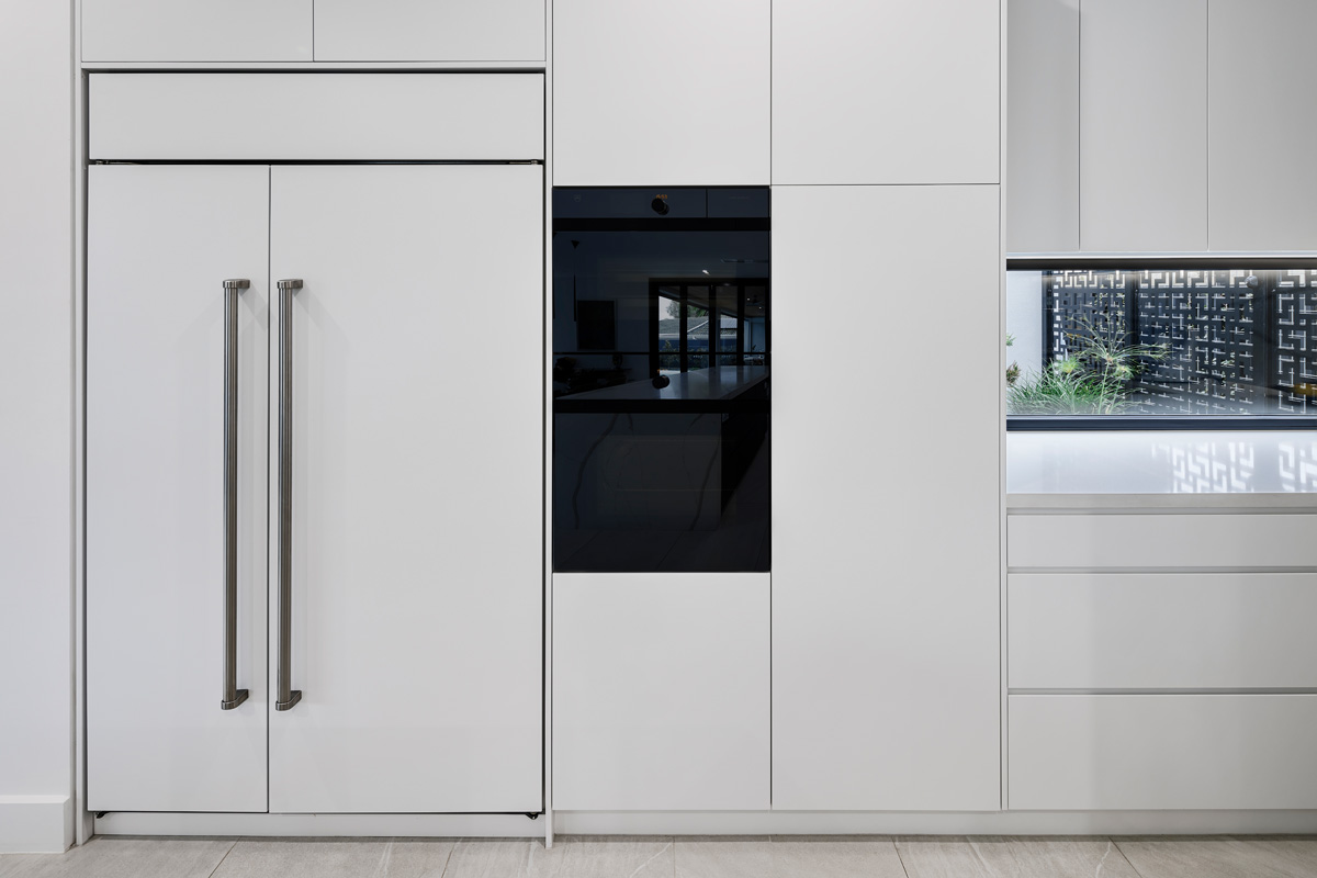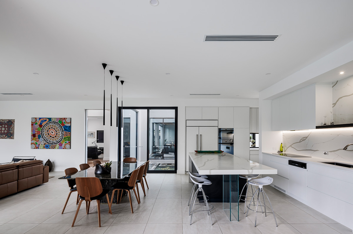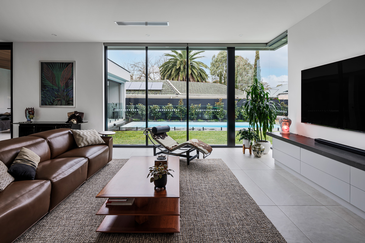 The home is designed to balance entertaining and family lifestyle with a thoughtful zoning strategy. A dedicated ‘entertainment wing’ integrates the alfresco, kitchen, and pool areas, while separate wings provide private family spaces. The main living room features a full-height glass wall connecting seamlessly to the outdoor pool, with additional alfresco amenities including an outdoor kitchen, fire pit, and cantilevered concrete seating. Smart home technology, feature windows, and level transition drains ensure functionality without compromising the sleek, linear aesthetic.