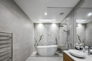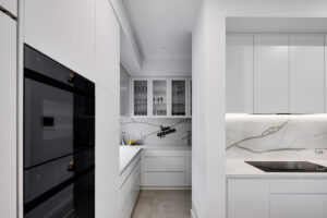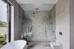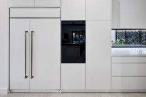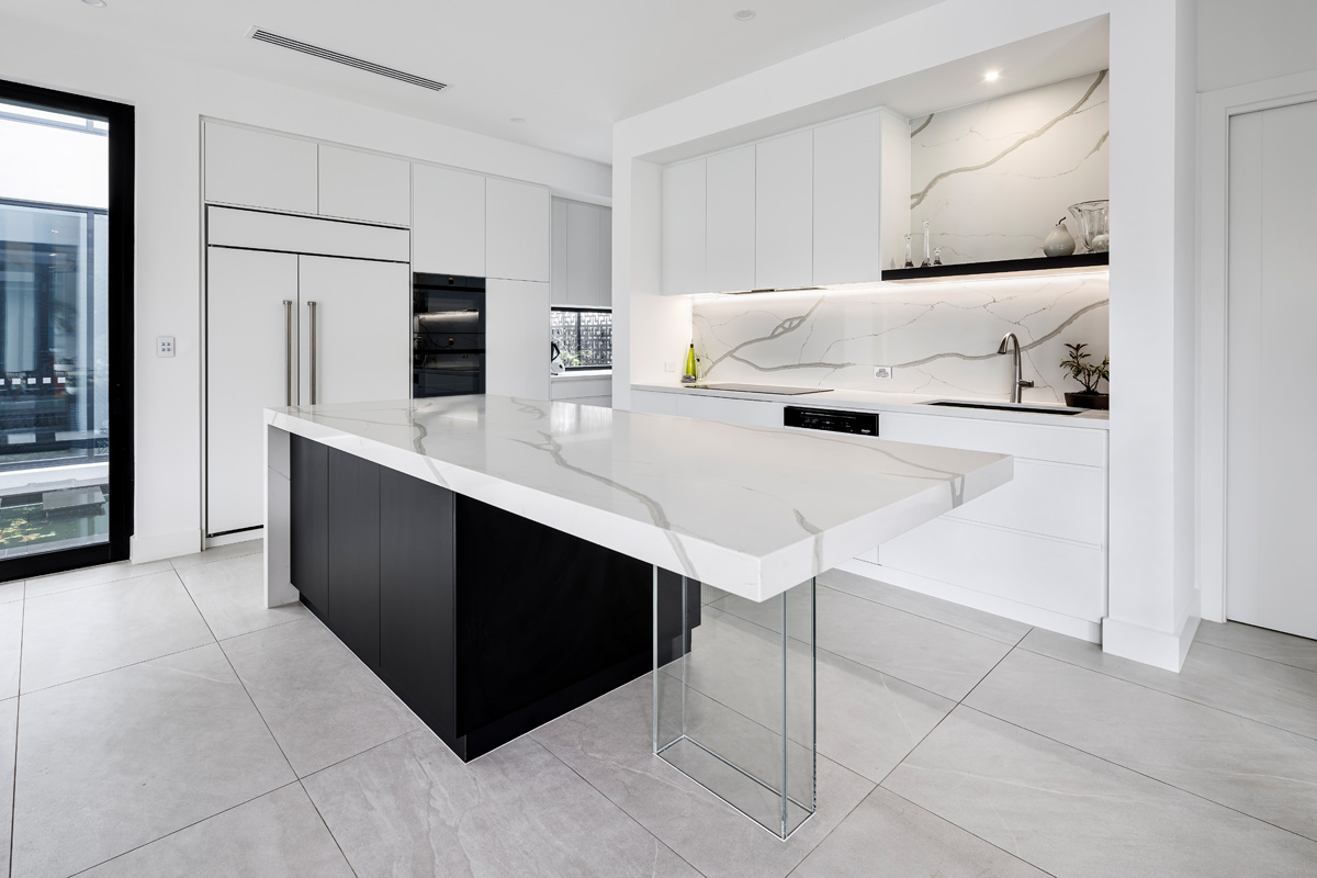Luxurious finishes and bespoke joinery elevate the home’s design. Western red cedar cladding, spotted gum stair treads, and a channel-set glass balustrade combine with 20mm Calacatta Bianco Smartstone benchtops that extend into the island and splashback. Polished mirror doors, rectified tiles from Italia Ceramics, skylights, and custom cabinetry create a sophisticated interior, while a 3-car garage with EV charging, a Sub-Zero fridge, and Realflame fireplace ensure convenience and comfort. Every detail has been meticulously considered to deliver a home that is both visually stunning and perfectly suited for modern family living.